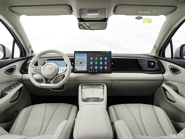 内饰方面,海狮05 DM-i采用环抱式海洋律动座舱设计,整体风格简约温馨,主打家用舒适与科技感的平衡。车内提供杏仁米等内饰配色,座椅及中控台等区域大面积采用软质包覆,搭配细腻缝线与镀铬装饰,触感与质感表现符合定位。配置层面,新车搭载嵌入式全液晶仪表,搭配自适应旋转悬浮中控屏,中控屏周边以贯穿饰板覆盖,简化实体按键布局,仅保留横向排列的核心功能按键。方向盘为三辐平底样式,配备电子怀挡,通道区域台设有双手机无线充电面板,提升日常使用便利性。