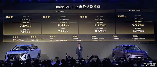 [汽车之家 新车上市] 4月8日,奇瑞瑞虎7L正式上市,新车共计推出4款车型,新车官方指导价8.59-10.69万元,限时优惠价7.89-9.99万元,超级置换价7.19-8.99万元,新车定位为一款紧凑型SUV,是瑞虎7家族新成员,搭载1.5T和1.6T涡轮增压发动机。