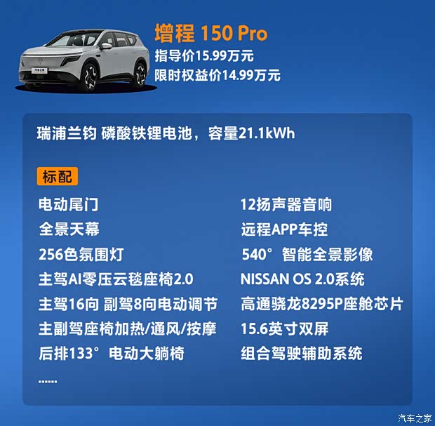 接下来配置分析,日产NX8共7个车型,增程与纯电各对应三款配置,纯电还有一款特别的品牌大师版。我们先从增程版开始,入门的增程 150 Pro,指导价15.99万元。采用瑞浦兰钧磷酸铁锂电池,容量21.1kWh。从前面也能了解日产NX8起步配置很全面,特别是舒适性。
