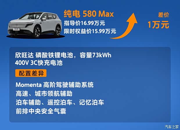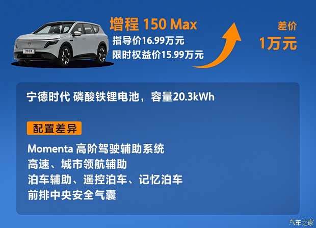 然后增程 150 Max,指导价16.99万元,贵了一万元,电池为宁德时代磷酸铁锂电池。容量20.3kWh,CLTC纯电续航一样为150km。配置上的差异就是有了Momenta 高阶驾驶辅助系统,有激光雷达,高速及城市领航辅助NOA,各种泊车辅助都有了,还多了前排中央安全气囊。有了高阶驾驶辅助,日常出行的安全性和便利性更高,推荐。
