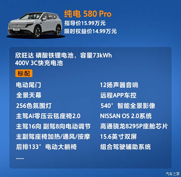 对于不考虑预算的朋友,日产NX8品牌大师版就是为你而来,限时权益价19.99万,就是在高配纯电 650 Max的基础上,把所有选装都给你安排了,还有e-Damper电控减振器系统带防晕车模式,以及发光格栅和感应电动门。