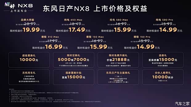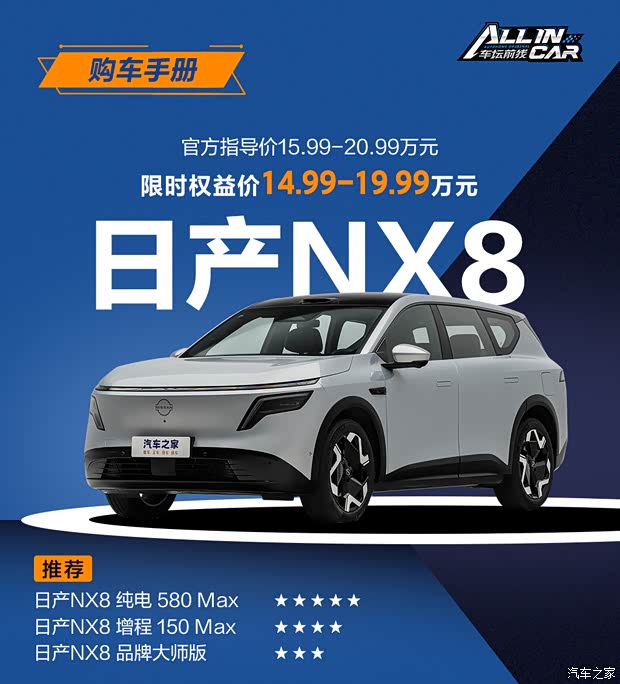[汽车之家 购车手册] 4月8日,东风日产NX8正式上市,共推出7款车型,官方指导价15.99-18.49万元,限时权益价14.99-17.49万元。此外,官方还推出了NX8品牌大师版,官方指导价20.99万元,限时权益价19.99万元。东风日产NX8基于天演架构2.0打造,提供纯电、增程双动力选择,还有宁德时代电池和Momenta辅助驾驶。接下来,我们通过配置与价格分析,看看日产NX8哪个配置更适合你?