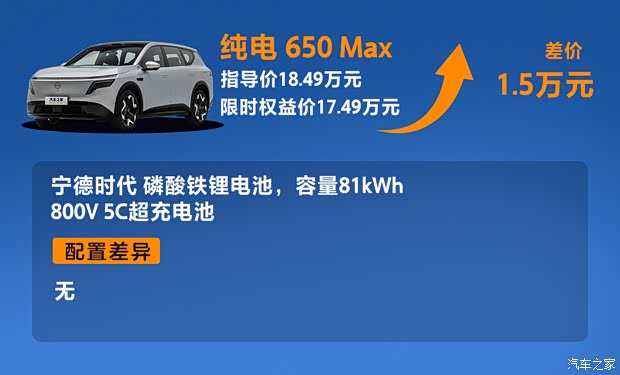 纯电版本,依旧推荐中配580 Max版,相比之下纯电 650 Max版贵了1.5万元,有了宁德时代800V 5C超充电池,81kWh的容量也多了70km的续航,对于多数家庭用户,或者都市用车为主的朋友,可以节约下,当然选它肯定更好。