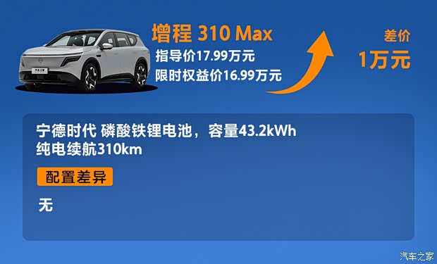接着增程 310 Max,指导价17.99万元,差价依旧一万元,升级宁德时代43.2kWh大电池,CLTC纯电续航310km。同样叫Max版,配置层面与增程 150 Max一样,主要就是更大的电池,更长的续航。