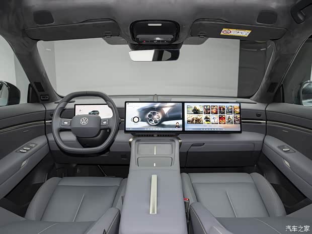 内饰采用环抱式座舱,搭配无级可调环绕隐藏式氛围灯,风格简约豪华。驾驶位配10.25英寸全液晶仪表与双辐双色多功能方向盘,中控台为双14.96英寸2.4K超高清智能双联屏,搭载高通骁龙SA8295P高性能座舱芯片,副驾屏带防窥功能,支持三指滑屏与独立音源输出。全新一代Gen-X方向盘集成可发光大众徽标,物理按键集中布局,使驾驶辅助与信息娱乐操作更加直观便捷。车机搭载AI智能伙伴,融合智谱AI与文心大模型能力,支持3D形象自定义、离线语音控制与免唤醒操作。车内提供隐夜黑、暖居米、冰晶蓝三种内饰主题,可选装Nappa真皮与麂皮绒顶棚。