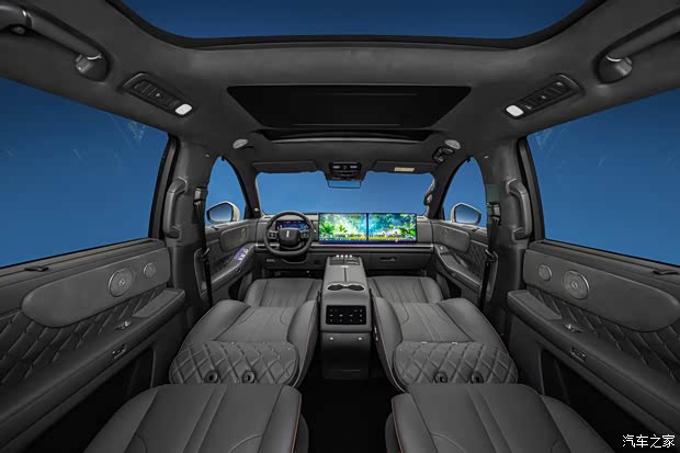 全⻋配备Coffee AI Sound音响系统,共31个稀⼟强磁扬声器,包括四座头枕扬声器(⼀排、⼆排每个座位配置2个独⽴的头枕扬声器),采⽤双独⽴功放,功放峰值功率3080W,采⽤8.1.4.8⾳响架构,智能前后排声场分区。流媒体内后视镜内嵌9.2英寸高分辨率显示屏,配合60°广角摄像头,视野可覆盖三车道,同时支持画面视角、画面缩放无极调节。